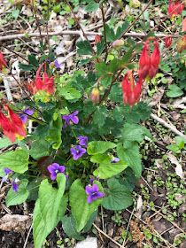 The blooms on the columbine are so delicate that I try to never touch them. Wild blue violets have popped up by the Columbine.